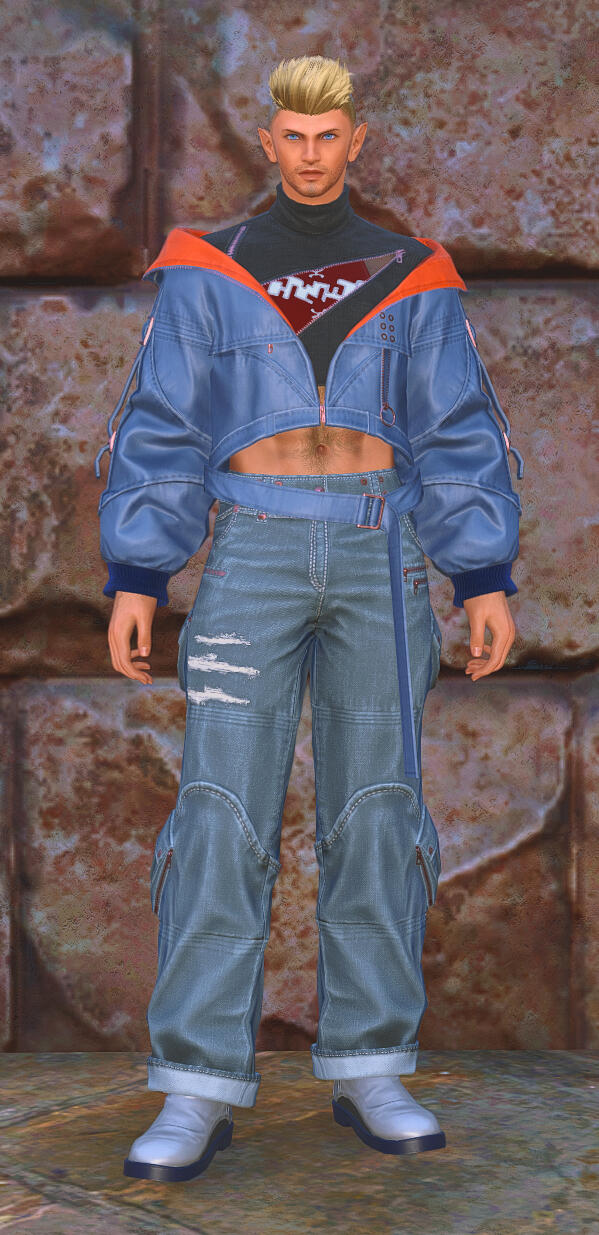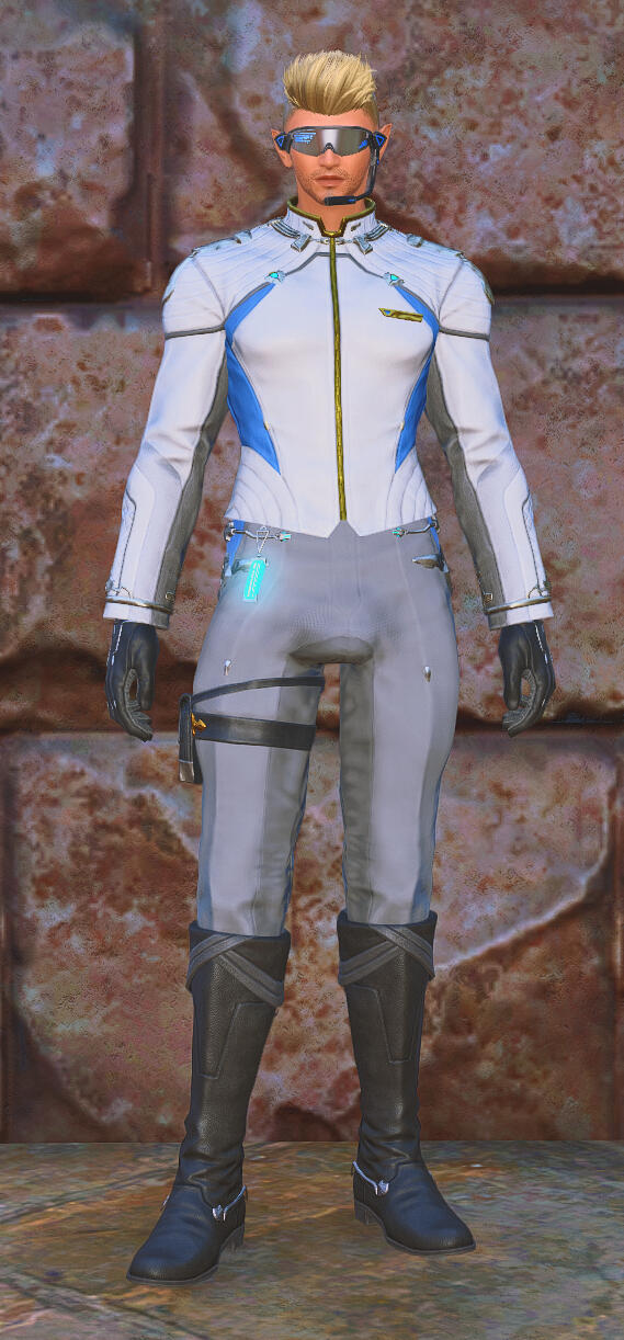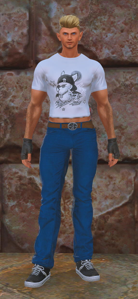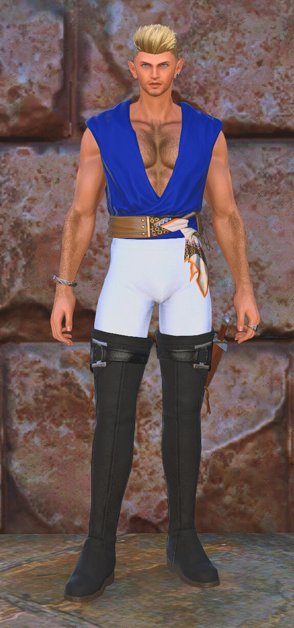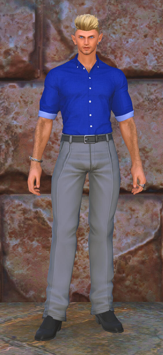 Henri is a biracial Elezen/Hyur of Ishgardian origin and Avalonian heritage. His body is athletic, toned and muscular, a result of regular physical labor as well as an active adventuring lifestyle. His golden-tanned skin is covered in light body hair, and he wears a cinnamon and mint cologne with undertones of machine oil and ceruleum. His dark blonde hair is worn in a spiky military-style undercut with golden blonde highlights, and his eyes are a striking steel-blue in color, changing to a more vibrant electric-blue when he is manipulating aether. His face is classically handsome, with a strong jaw, high cheekbones, full lips... and the pointed ears of his Elezen heritage. His tenor voice, soft and pleasant to the ears, bears a slight Ishgardian [read: French] accent.His clothing, which often contains at least some trace of blue, tends to be stylish, well-tailored to his physique, and somewhat more revealing than the conservative styles prevalent in Ishgard. When he is dressed for "work", as it were, most of his attire is custom-ordered from Tataru Taru's boutique for adventurers, as he is a huge fan of the fusion of form and functionality in her work. Both of his ears are pierced, and he tends to wear simple silver and blue jewelry in the style of the Masked Carnivale's Blue Mages. For those with aethersight or other means of detection, Henri's aetheric aura is a vibrant azure blue in color, though when using the blue magic technique of Aetheric Mimicry, his aether will shift in color to match the person being mimicked.